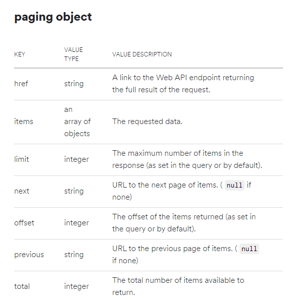 spotify 의 경우에는 api 자체에 페이지네이션을 하는 방법이 잘 설명되어 있어 참고하면서 페이지네이션을
