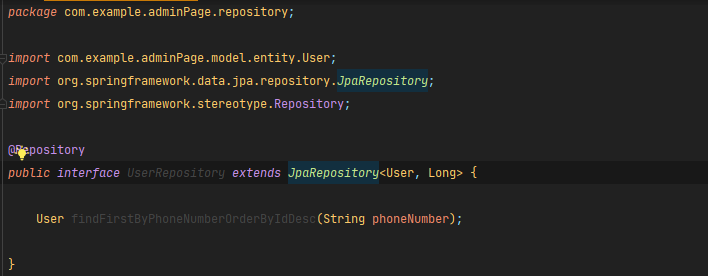 위 위미리의 형태로 내가 사용하고자 하는 interface 를 만든 다음에 거기에 JpaRepository 를 상속해주면 된다.