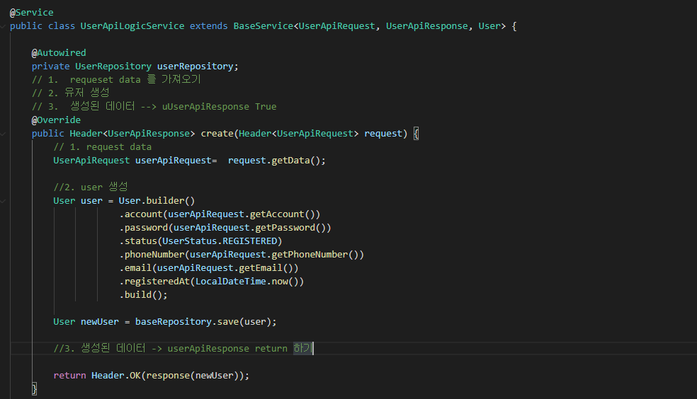 주석에서 기록한 스텝에 맞추어 데이터를 전달하는 프로세스로 이루어져 있는데, 데이터베이스에 데이터를 넣기위해 특정한 양식으로 데이터들을 2 번 user 생성에서 가공하고 있는 모습이다.