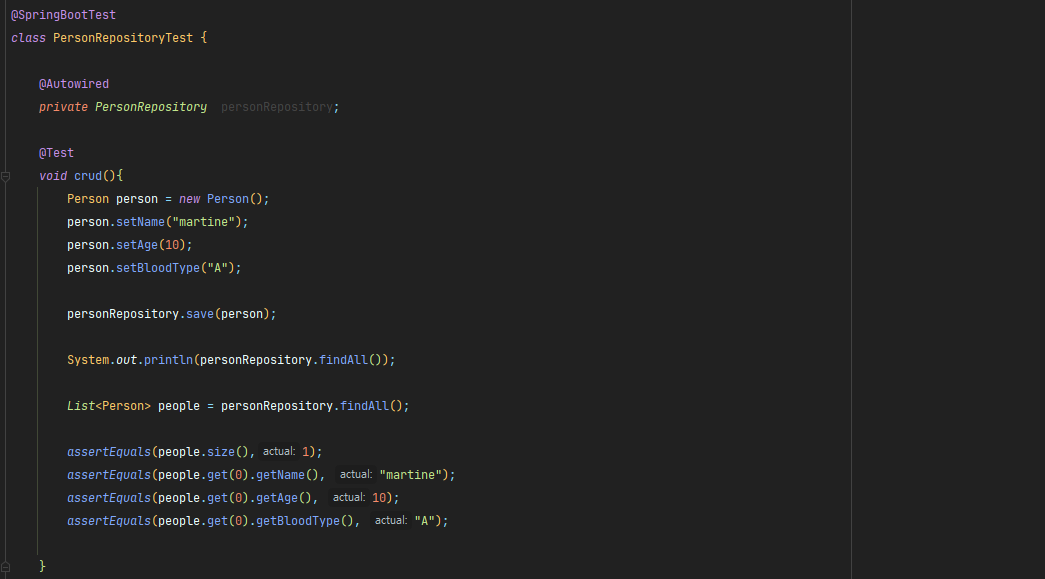 Jpa Repository 는 MyBatis 에 직접 치는 SQL 쿼리문 등을 모아놓은 것이라고 생각하면 편한데, 우리가 직접 치는 수고를 덜어줘 객체르 관리하는 것에 더욱 집중하게 만들어준다. 아래는 Test 에서 사용했는데, 대체적으로 Service 에서 아래와 같이 JPA를 사용한다고 보면 될 것 같다.