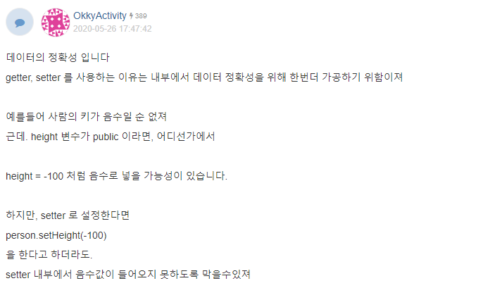 Getter와 Setter를 사용하는 이유가 객체의 무결성을 보장하기 위함 이라고 하는데, 객체의 무결성 이라는게 무엇인가요?