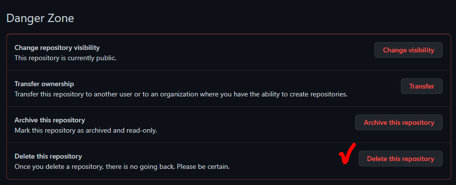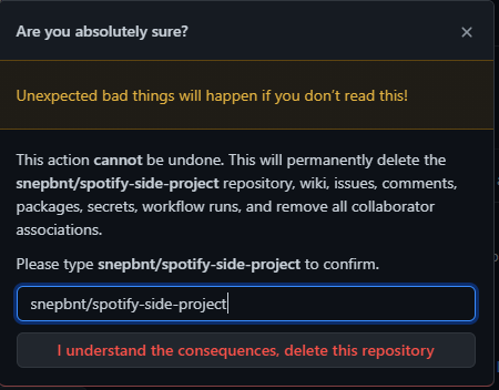 삭제할 리포지토리의 이름을 입력하면 되는 간단한 과정이다. 제거할 리포지토리의 이름을 입력해주면 리포지토리 삭제가 끝난다.