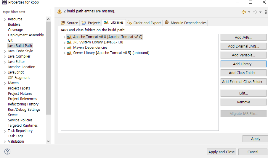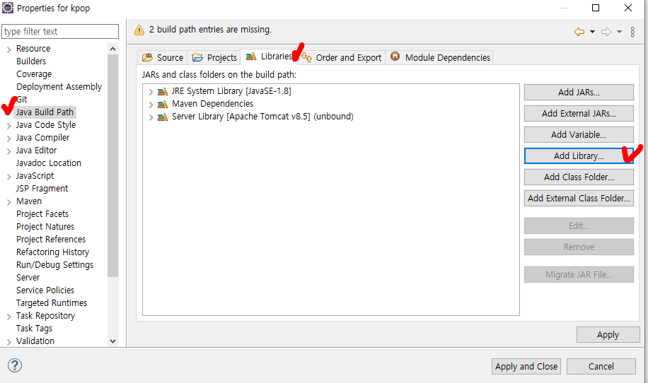 2) 왼쪽의 Java Build Path 를 클릭한 후에 Libraries 를 선택한다. 그리고 Add Library 를 선택한다