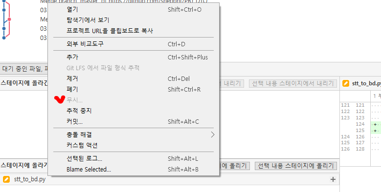 1) commit 할 때 불필요한 파일을 '오른쪽 마우스 클릭'한 후 무시버튼 클릭