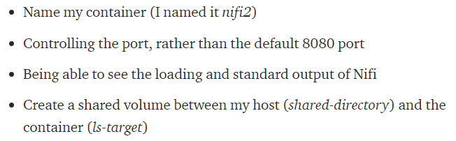 docker run --name nifi-docker -p 8091:8080 -i -v ~/document/Nifi/shared-directory:/opt/nifi/nifi-current/ls-target apache/nifi