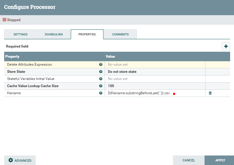 filename 이라는 property 를 만들어 아래와 같이 nifi 만의 언어를 사용하여 파일이 만들어질 때, 특정 형태로 파일이 만들어지도록 설정한다