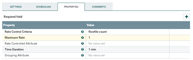 흐르는 file 을 컨트롤 하는 것이기 때문에 Rate Control Criteria 는 flowfile count 로 해주고