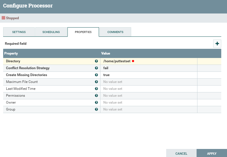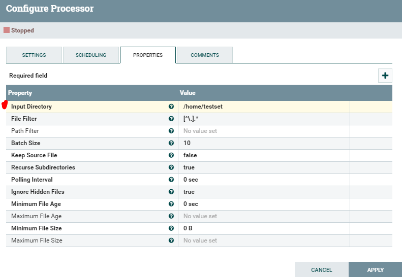 GetFile 프로세서는 특정 경로에 있는 파일을 가져오는 프로세서이다. 환경설정에 들어가서 properties 를 클릭하면 input directory 라는 property 에 input 하고자 하는 파일들이 있는 경로를 지정해주면 알아서 파일을 가져온다