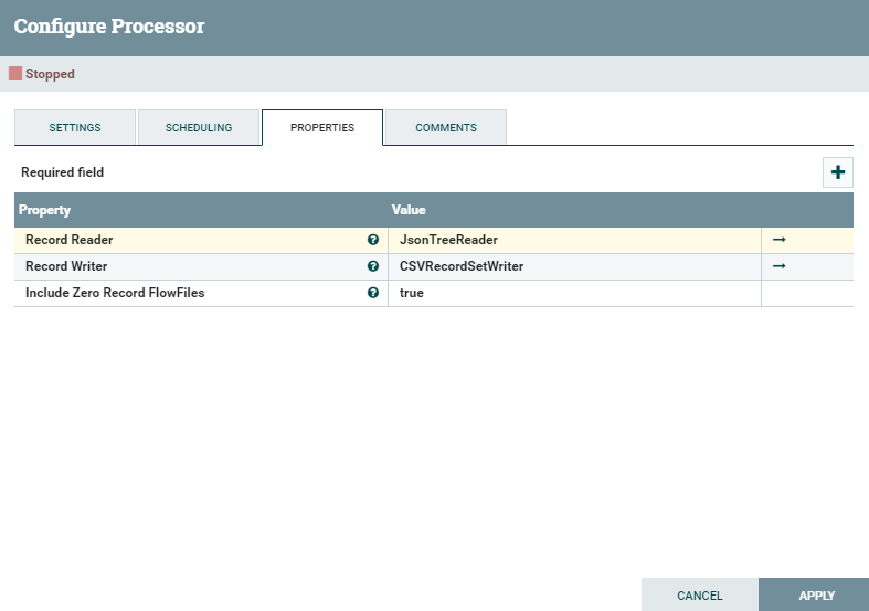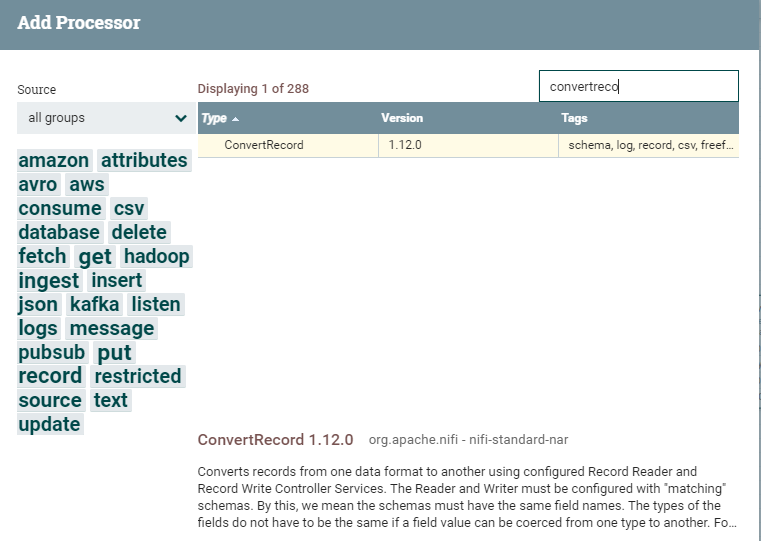 위 설정들을 마무리하고 난 뒤 convertRecord 프로세서에 아래와 같이 등록한다