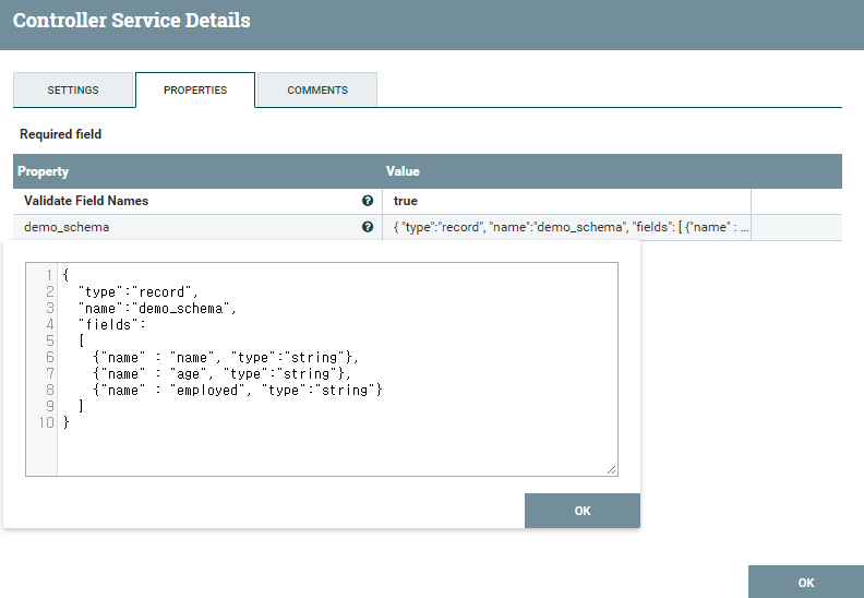 이 그룹 환경설정은 avro, json, csv 등의 확장자들이 그들이 가지고 있는 스키마에 접근하고 등록하게 도와준다. 즉 이 레지스트리를 등록하면 추후 CSVRecordSetWriter, JsonTreeReader 가 json 파일에 접근할 수 있게 도와준다.