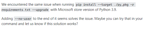 https://stackoverflow.com/questions/63783587/pip-install-cannot-combine-user-and-target
